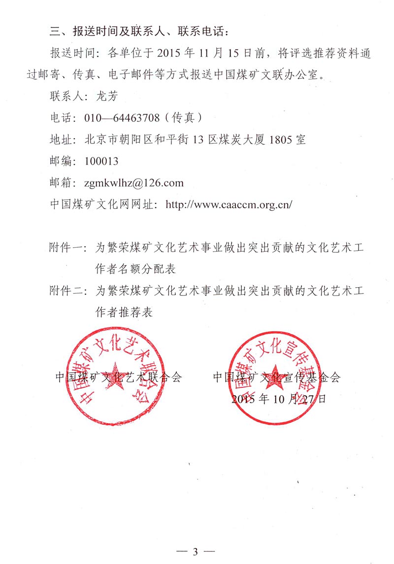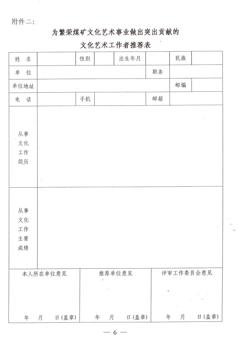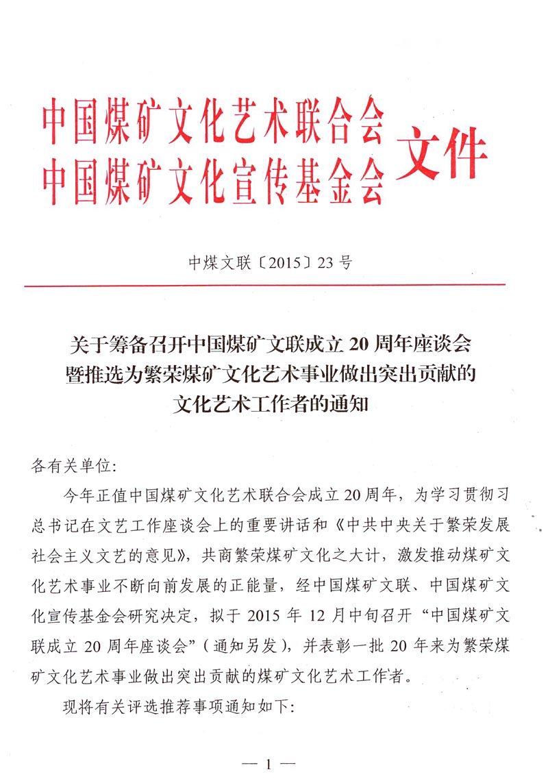 關于籌備召開中國煤礦文聯成立20周年座談會暨推選為繁榮煤礦文化藝術事業做出突出貢獻的文化藝術工作者的通知 來源: 作者: 時間:2015-10-30 【字體:小 大】 附件一:為繁榮煤礦文化藝術事業做出突出貢獻的文化藝術工作者名額分配表 附件二:為繁榮煤礦文化藝術事業做出突出貢獻的文化藝術工作者推薦表 智能標簽: 煤礦文聯 工作者 相關內容 分享到: 【打印正文】