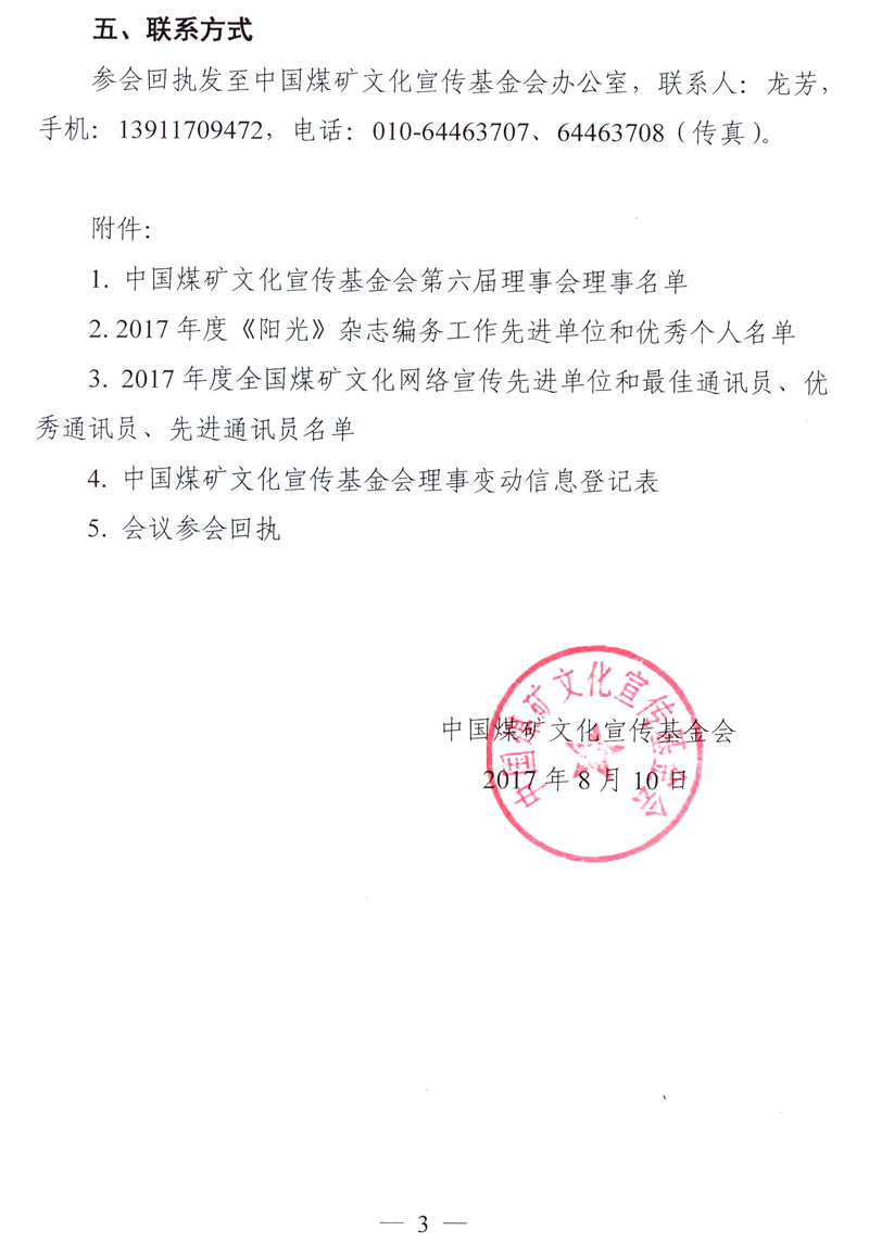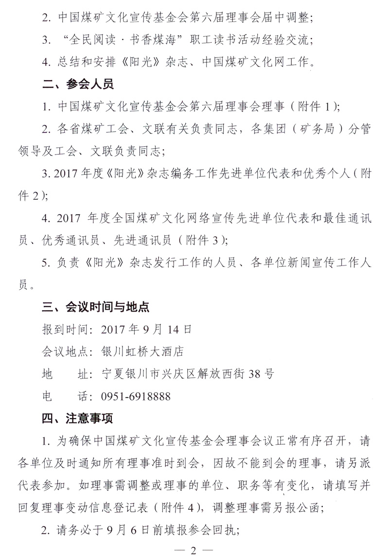 關(guān)于召開中國煤礦文化宣傳基金會第六屆理事會第九次會議的通知 來源:中國煤礦文化宣傳基金會 作者: 時間:2017-08-21 【字體:小 大】 附件: 1. 中國煤礦文化宣傳基金會第六屆理事會理事名單 2. 2017年度《陽光》雜志編務(wù)工作先進(jìn)單位和優(yōu)秀個人名單 3. 2017年度全國煤礦文化網(wǎng)絡(luò)宣傳先進(jìn)單位和最佳通訊員、優(yōu)秀通訊員、先進(jìn)通訊員名單 4. 中國煤礦文化宣傳基金會理事變動信息登記表 5. 會議參會回執(zhí) 智能標(biāo)簽: 中國煤礦文化宣傳基金會 相關(guān)內(nèi)容 分享到: 【打印正文】