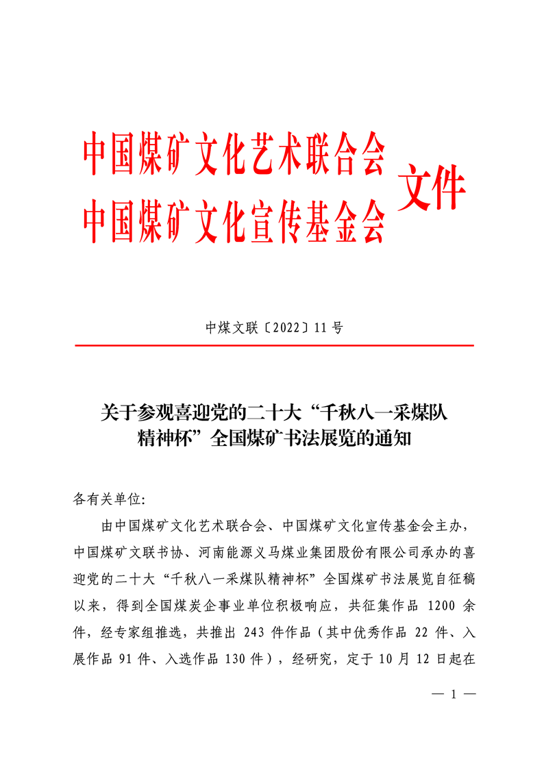 關于參觀喜迎黨的二十大“千秋八一采煤隊精神杯”全國煤礦書法展覽的通知