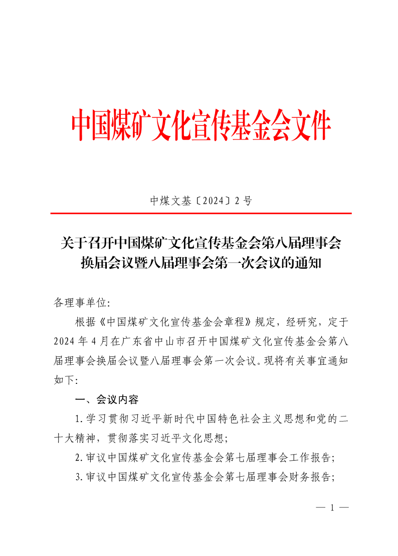 關(guān)于召開中國(guó)煤礦文化宣傳基金會(huì)第八屆理事會(huì)換屆會(huì)議暨八屆理事會(huì)第一次會(huì)議的通知