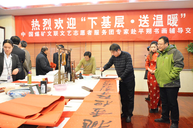 1月31日,由中國煤礦文聯主辦,中煤平朔集團公司承辦的“走基層·送溫暖”中國煤礦文聯文藝志愿服務走進平朔活動在平朔礦區舉行。此次活動由中國煤礦文化宣傳基金會理事長、中國煤礦文聯副主席龐崇婭帶隊,中國煤礦文化宣傳基金會副理事長劉俊,中國煤礦文聯副秘書長、《陽光》雜志社社長兼主編盛軍,中國煤礦文聯宣傳處副處長辛凡忠和著名煤礦書法家馬銘、陳彥豐、楊玉劍,畫家陳思羽、呼玉忠、呂秀芹、仲立,著名相聲演員連春建、張濤,青年歌唱演員孫國玉、田野等多位藝術家以及《中國藝術報》記者王雨檬,《中國煤炭報》記者孫寶福等參加志愿服務。