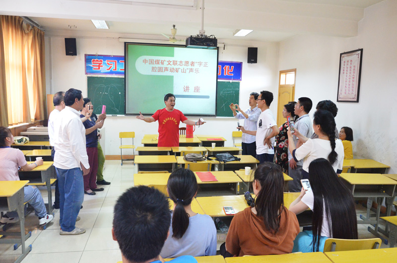 在朱莊煤礦職教學校,礦區的聲樂愛好者們早早地聚在了“字正腔圓 聲動礦山”聲樂講座的課堂。著名歌唱家王海天結合學員們的實際情況,把專業問題通俗化,生動有趣、深入淺出地講解吐字、發聲、氣息、共鳴等方法技巧。老師手把手地教,學員一遍一遍地練,現場氣氛熱烈。王海天毫無保留地把自己多年的演出、實踐、教學和創作經驗傳授給學員,并耐心地幫助解決學員在音樂表演和創作方面的困惑和難題。最后,一曲師生合唱《草原上升起不落的太陽》為聲樂講座畫上了圓滿的句號。