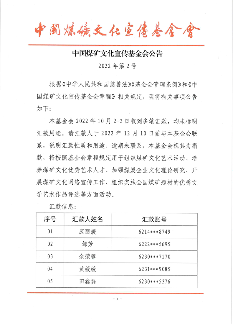 中國煤礦文化宣傳基金會公告 2022年第2號