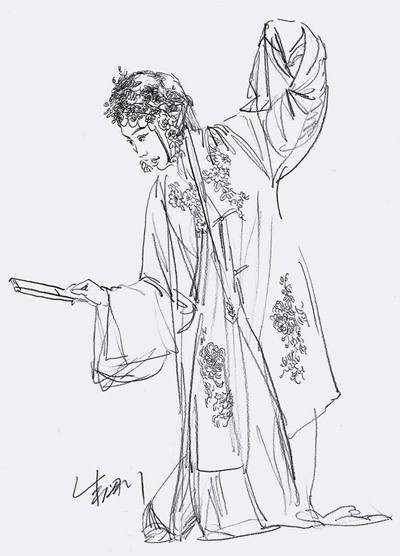 他的戲曲速寫,是他與戲中人物彼此理解的對話,是深入戲劇情境和人物內心的精神之旅,可以從中感受到畫家速寫時的感動、心跳和溫度。要形似,更要神似?!妒遑灐分袏浒⑹笮捏@肉跳的探頭探腦,《紅娘》中紅娘成全鶯鶯張生好事,作為丫鬟帶著點少女羞澀的喜悅,《牡丹亭—尋夢》中杜麗娘夢醒時分的悵然若有所失,《空城計》中諸葛亮緊張的內心和從容的氣度,畫家簡約明快地抓住演員的形體動作表情,把稍縱即逝的人物內心情感與心理微妙變化的起伏呈現在速寫近乎下意識的線條里,以長短、疏密、深淺、柔和堅硬的線條變化,呼應鼓板和人物生命的節奏。特別難能可貴的是,朱剛幾乎就在劃一根火柴的一剎那間,便能勾畫出演員臉部表情、行頭的細節印象,尤其是人物眼神或明亮或暗淡、或活潑或成熟的種種變化。