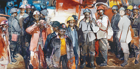 我們進入狀態開始作畫。半小時左右,礦工問我們:“好了嗎?”我用筆蘸著顏色,請他站起來休息,同時迅速將畫板鋪平,鋪畫大顏色。他站了一會兒,又坐回原處。我將第一遍顏色用電吹風吹干,將畫板豎在畫架上繼續作畫,礦工已經坐立不安,一會兒抬抬帽子,一會兒摸摸自己的臉,一會兒摳摳后背。我知道他勞作了整整一夜,現在最需要的就是躺倒休息。我心存內疚卻又不肯停筆,我想把他的這種狀態準確地表達出來,把勞動者辛苦的狀態表達出來。我抬眼與礦工的目光撞在一起,他不好意思地對我說:“沒啥,就是想睡。”就在此時,我幾乎忘記了所有的技巧,只想用最短的時間將我面前這位疲憊的礦工迅速畫完。