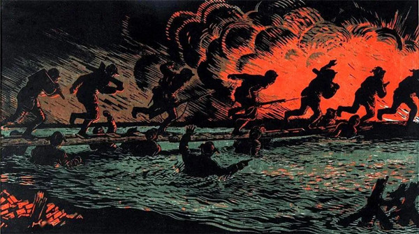 早在延安時期,木刻藝術家們便用手中的刻刀,表現黨領導下的人民軍隊始終與人民群眾勠力同心、并肩戰斗的情景。胡一川的《到前線去》、力群的《飲》、彥涵的《當敵人搜山的時候》、古元的《人橋》等經典名作,以單純而有力的木刻藝術語言,成就了對于崢嶸歲月的視覺記錄與詩意表現,展現了家國危難之時藝術創作的重要作用。