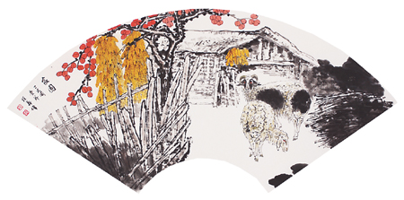 從創(chuàng)作心理來看,可以感覺得到程義偉有一種藝思,有一種追求。他身居鬧市,但心向鄉(xiāng)野、農(nóng)村;他參與人際交往,但卻鐘愛忠誠、勤勞、溫馴、靈動的家禽家畜,總體上是對自然、農(nóng)村、與人類生活關(guān)系密切的家養(yǎng)動物的親近、鐘愛,還有著某種寄托。這是對比中的尋求,是熱鬧中的清靜、繁華中的素樸、現(xiàn)代中的傳統(tǒng);是鬧市中的意念鄉(xiāng)野、世俗追求中的超脫。就其已經(jīng)達(dá)到的程度而言,他的扇面畫,給欣賞者以這樣的啟示和聯(lián)想;就其努力的方向來說,我們可以期待他進(jìn)一步的思索和發(fā)展。