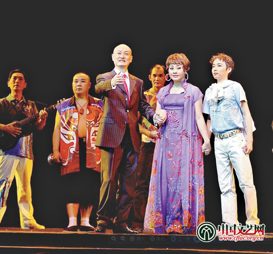 現(xiàn)代京劇《生活秀》中,劉子微(右二)與關(guān)棟天(左三)聯(lián)袂出演