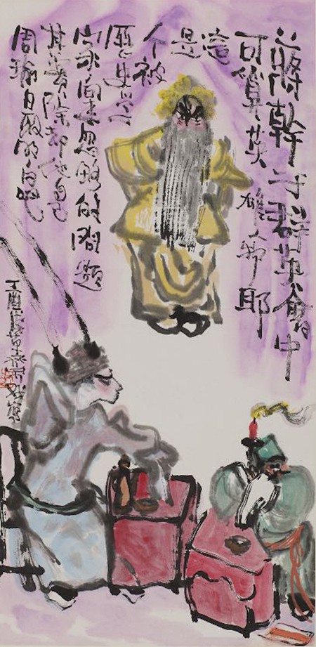 戲曲人物畫創作,從其藝術趣味和文化品質而言,大體分為借戲入畫和入戲生畫兩類。前者重在形式融合,后者重在精神契合。前者以林為代表,林風眠的戲曲畫是最具現代繪畫意識的。他注重的是通過戲曲舞臺形象進行新的繪畫形式與觀念的探索,或者借用舞臺情節故事的形象再創造,表達自己內心強烈的情感體驗。因此,他的戲曲人物畫的“戲味”并不濃厚,更多的是借題創作一種獨特的戲曲畫“重構”形式。20世紀5O年代林風眠開始思考“從舊戲的動作分化后再設法構成創作,在畫面上或者可能得到時間上綜合的觀念。”如《水漫金山》通過壓平折疊空間,將主體人物與其他表現對象同置放于一個平面,對于舞臺人物的連續動作進行分化和再構成。《寶蓮燈》將主要人物和背景事物通過切割線,并置于畫面上,形成幾度空間呈現,使得戲劇情節獲得時間上的錯覺延續。在傳統濃墨重彩的技法上推陳出新,結合西畫之中覆蓋法表現,適當加以水粉著色,使畫面色彩濃重而飽滿,獨特地體現出一種融和中西的綜合之美。后者則以關良為端倪,關良是現代最早將中國傳統文人水墨語言引入戲曲人物畫的大家。他在追求形神兼備的同時,常運用沒骨寫意的手法描繪戲曲人物,運用“鈍、滯、澀、重”的筆墨手法,并善于對人物形態的夸張變形,充分展現文人畫傳統的寫意天趣,并將西方現代表現主義的某些語言融入其水墨戲曲人物畫創作之中。關良的戲曲人物畫注重追求表現戲曲舞臺的精彩瞬間,抓住最突出的故事情節或人物性格的動作和表情,講究人物比例重心,以及動作上的合乎舞臺板眼節奏,創作一種獨特的戲曲畫“瞬間”形式。觀其畫似觀戲,而且大有勝似觀戲的文化回味,以表述戲曲舞臺的真實形態為主要目的,包括舞臺人物和舞美(道具、服飾、布幕等),非常寫實和接近舞臺實況,記錄了許多經典曲目的最精彩的瞬間。