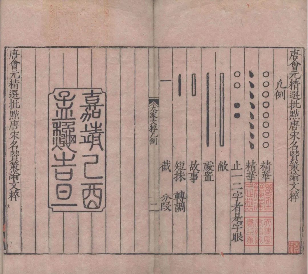 明代的文章圈點法也有隨明代文章學(xué)之發(fā)展而呈現(xiàn)的新變。《文體明辨》收錄唐順之批點法,《唐宋八大家文鈔》推行唐、王二家讀書法,皆表明在明代的諸多圈點用例中,唐宋派諸家的評點本影響很大。唐順之的文章評點主要見于《文編》《唐會元精選批點唐宋名賢策論文粹》《唐荊川批點文章正宗》等評點本,其中最能體現(xiàn)其評點之功的當(dāng)屬《文編》。該書所用圈點基本符合《大明唐順之批點法》所錄之長圈、短圈、長點、短點、長抹、短抹、截等幾種形式,其作用正如書前自序所說“學(xué)者觀之,可以知所謂法矣”14,是以指示文法為標(biāo)的的。唐順之圈點法的符號及其含義的說明,見于嘉靖二十八年(1549)由書坊所刊的《唐會元精選批點唐宋名賢策論文粹》,是書卷首《凡例》標(biāo)明了唐順之圈點之法: