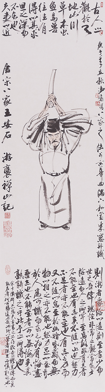 馮遠的人物畫“唐宋八大家”系列,比之“先秦諸子”系列,筆墨更為開張、簡練,凸顯出文人放達的性情和復雜的性格。韓愈、柳宗元、蘇氏三父子、歐陽修、曾鞏等人,文章蓋世,事功驚人,復合型的身份讓他們在政治與文章中游走,人格飽滿又深刻。“唐宋八大家”系列的書法長跋讓人耳目一新。當代國畫的書法缺失,早已引起有識之士的憂慮。沒有毛筆字題款的國畫作品,會降低當代國畫創(chuàng)作的品質。因此,要求當代國畫家提高書法水平的呼聲越來越高。馮遠注重書法的研習,注意書法對畫作的促進與提升。1977年他在浙江美術學院攻讀研究生,三年的系統(tǒng)學習,讓他認識了神秘而博大的傳統(tǒng)藝術世界。浙江美術學院(今中國美術學院)重視書法,是最早設置書法專業(yè)的美術學院,當然要求美術學院學生也要學習書法。馮遠在青少年時代染指丹青,也弄翰墨,進入大學,勤于臨帖,鑄就了自己的筆墨功夫。他的畫作,書法占比較大,“唐宋八大家”系列就是證明。他大幅度題跋,有的是抄錄所繪人物的詩文,有的是書寫個人的感受、感想,以不同的文辭,不同的書體,強化畫作的文化含量。書法對國畫有文辭和筆墨的雙重推進,前者是主題深化,后者是藝術手段,這一點,牛克誠一語中的:“馮遠的人物畫,通過讓堅實的造型功底與書法式的抒情筆墨結合,讓現(xiàn)實主義的創(chuàng)作題材與厚重博大的精神傳統(tǒng)相聯(lián)結,建立起具有鮮明時代感的語言形式。”