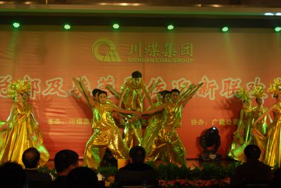晚會在龍灘煤礦職工自編自演的一首歌舞劇《川煤明天更輝煌》中拉開帷幕,龍灘煤礦24位身著金黃色的參演人員以優美的舞姿、悅耳動聽的歌聲表達了1100名龍灘職工對川煤集團領導的新春慰問和美好祝愿;綠水洞煤礦演出的小品《川煤贊》,歌頌了川煤集團成立5周年來,在川煤集團黨政領導的正確指引下各項工作所取得的輝煌成就;南井煤礦演出的《春天來了》,以優美的舞姿、寓意深刻的內涵贊頌川煤集團各項工作正蒸蒸日上、一遍祥和的景象。這次廣能公司70名參演職工千里之行為川煤集團總部領導送上了深深的祝福,表達了煤礦兒女的豪邁之情,讓川煤總部職工度過了一個愉快的節日。