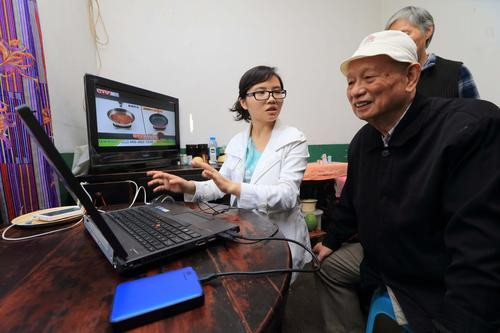圖為90后志愿者帶著筆記本電腦登門為吳爺爺解決看老電影的難事。
