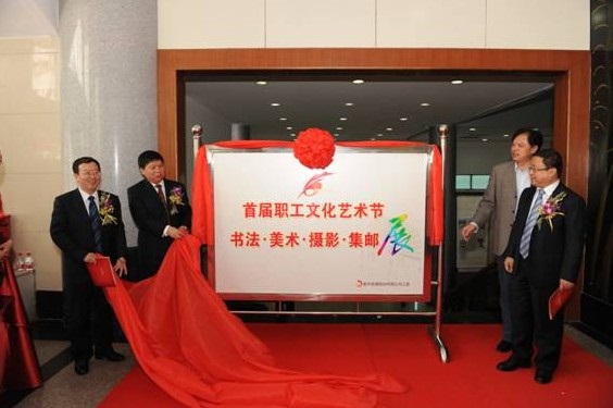 劉萬義、王錫洪、高金凱、宋仁濤共同為職工文化藝術節(jié)《書法、美術、攝影、集郵展》揭幕。