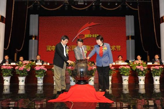 龐崇婭、祁澤民、靳亞利共同按動水晶球為冀中股份首屆職工文化藝術節(jié)正式拉開了帷幕