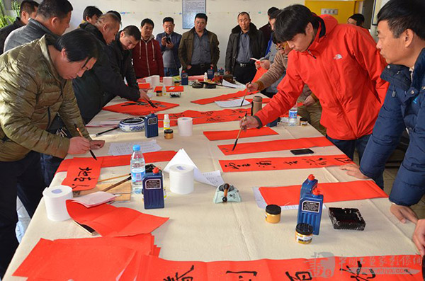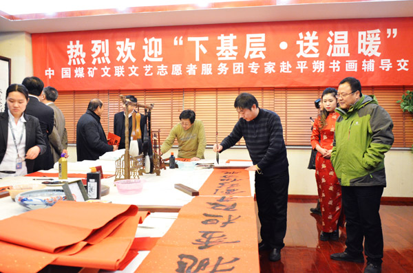 中國煤礦書法家協(xié)會(huì)積極響應(yīng)中國書協(xié)關(guān)于2016年元旦春節(jié)期間開展“萬名書法家送萬‘福’進(jìn)萬家”公益活動(dòng)的通知精神,認(rèn)真組織煤炭系統(tǒng)各企業(yè)書法組織開展送萬‘福’進(jìn)萬家活動(dòng)。1月31日,由中國煤礦文聯(lián)主辦,中煤平朔集團(tuán)公司承辦的“走基層·送溫暖”中國煤礦文聯(lián)文藝志愿服務(wù)走進(jìn)平朔活動(dòng)在平朔礦區(qū)舉行。活動(dòng)現(xiàn)場(chǎng)氣氛熱烈,藝術(shù)家們揮毫潑墨,為平朔礦區(qū)職工寫“福”字、寫春聯(lián),邊創(chuàng)作書畫作品邊和平朔礦區(qū)的書畫愛好者交流創(chuàng)作經(jīng)驗(yàn),筆會(huì)交流活動(dòng)共書寫“福”字200多個(gè),春聯(lián)60多套,創(chuàng)作書法作品50多件、美術(shù)作品10多件。藝術(shù)家們用飽蘸喜氣墨汁的畫筆創(chuàng)作出一件件飽含誠意的書畫作品,為平朔礦區(qū)職工紅紅火火的生活送上美好的祝愿。