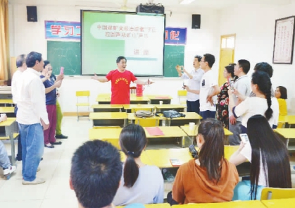 王海天是中國煤礦文聯(lián)的“老志愿者”了,每到一處,不僅要唱幾曲,而且要上一堂別開生面的聲樂課。朱莊煤礦職教學(xué)校老舊、墻皮斑駁。教室內(nèi),王海天與聽課的工友們在“字正腔圓聲動礦山”聲樂講座的課堂一起唱歌交流,不亦樂乎。王海天結(jié)合學(xué)員們的實(shí)際情況,把專業(yè)問題通俗化,生動有趣、深入淺出地講解吐字、發(fā)聲、氣息、共鳴等方法技巧。老師手把手地教,學(xué)員一遍一遍地練。王海天毫無保留地把自己多年的演出、實(shí)踐、教學(xué)和創(chuàng)作經(jīng)驗(yàn)傳授給學(xué)員,并耐心地幫助學(xué)員解決在音樂表演和創(chuàng)作方面的困惑和難題。最后,一曲師生合唱《草原上升起不落的太陽》為聲樂講座畫上了圓滿的句號。
