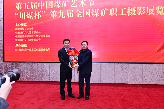 張強(qiáng)向川煤集團(tuán)贈(zèng)送了第五屆中國煤礦藝術(shù)節(jié)特別貢獻(xiàn)獎(jiǎng)杯并代表第五屆中國煤礦藝術(shù)節(jié)組委會(huì)講話。他指出,多年來,一批批煤礦攝影人活躍在全國各礦區(qū),穿梭在礦山和礦工之間,用鏡頭記錄著煤炭人生產(chǎn)生活發(fā)展變化的點(diǎn)點(diǎn)滴滴,煤炭行業(yè)的攝影家和攝影作品在全國全社會(huì)的影響力不斷擴(kuò)大。他強(qiáng)調(diào),作為新時(shí)代的煤礦文藝工作者,要緊密地團(tuán)結(jié)在一起,守住為煤礦工人謀幸福的初心,擔(dān)起推動(dòng)煤炭工業(yè)高質(zhì)量發(fā)展的光榮使命,積極投身火熱的煤礦生產(chǎn)生活,堅(jiān)定文化自信、把握時(shí)代脈搏、聆聽時(shí)代聲音,堅(jiān)持與時(shí)代同步伐、以人民為中心、以精品奉獻(xiàn)人民、用明德引領(lǐng)風(fēng)尚,切實(shí)肩負(fù)起新時(shí)代“培根鑄魂”的責(zé)任和使命,用優(yōu)秀的文藝作品記錄新時(shí)代煤炭工業(yè)的輝煌發(fā)展成果,以實(shí)際行動(dòng)慶祝偉大的新中國成立70周年。
