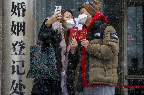 2020年2月14日是情人節,情侶們冒雪來到朝陽區民政局登記領取結婚證。今年受疫情影響只接受預約登記,辦理時隨辦隨走沒有出現往年排隊的現象。金質收藏 曹博遠攝