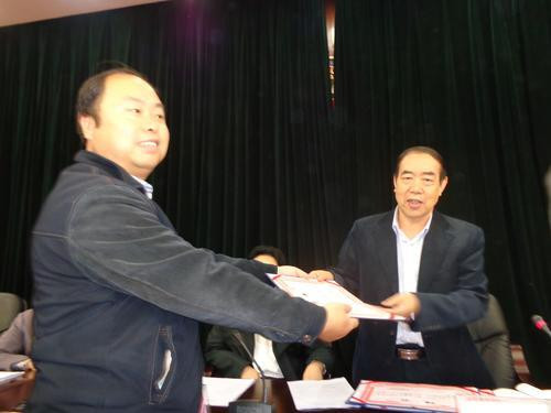 陜西省作協(xié)主席賈平凹(右)為陜西煤炭化工集團(tuán)作協(xié)副主席張春喜發(fā)聘書