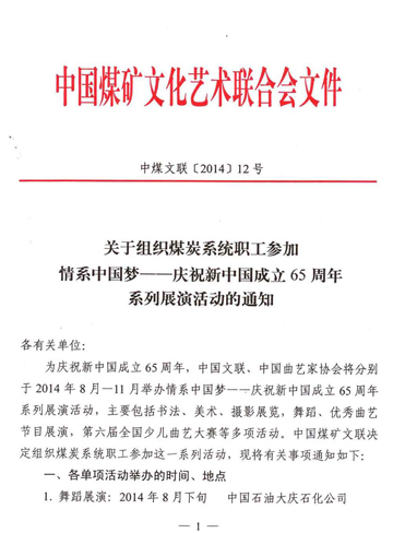 關于組織煤炭系統職工參加情系中國夢——慶祝新中國成立65周年系列展演活動的通知