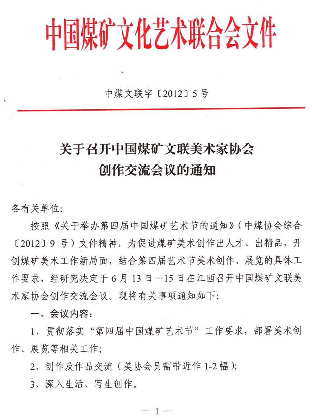關于召開中國煤礦文聯美術家協會創作交流會議的通知 來源:中國煤礦文化網 作者:煤礦文聯 時間:2012-05-11 【字體:小 大】 附件: 1、中國煤礦文聯美術家協會參加會議人員名單 2、參加中國煤礦文聯美術家協會創作交流會議回執 分享到: 【打印正文】