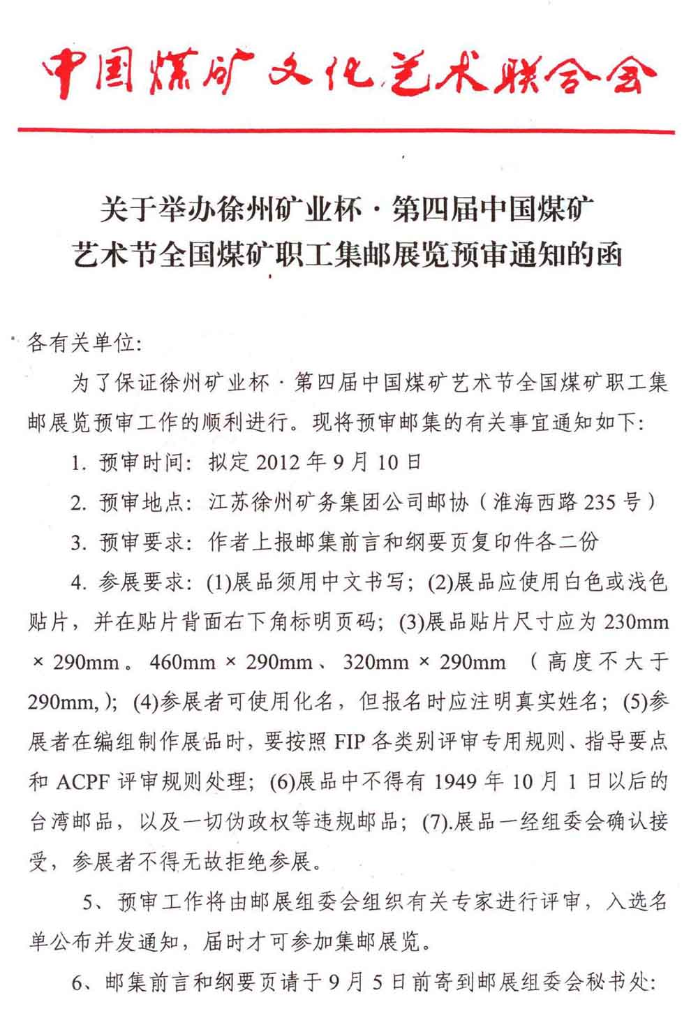 關于舉辦徐州礦業杯·第四屆中國煤礦藝術節集郵展覽預審通知的函