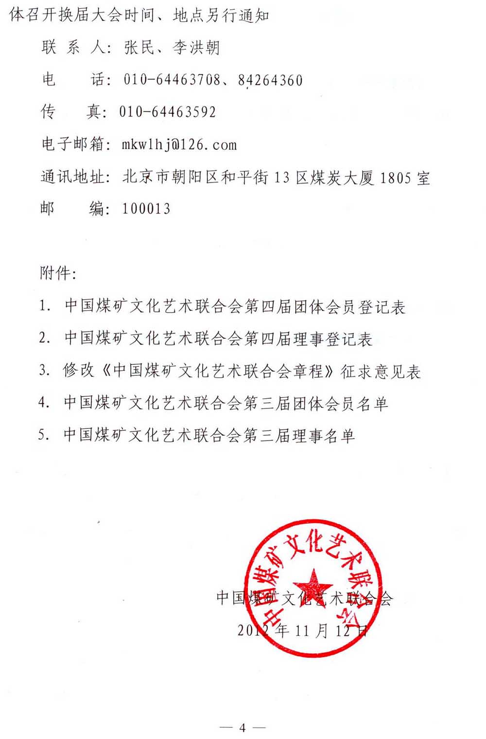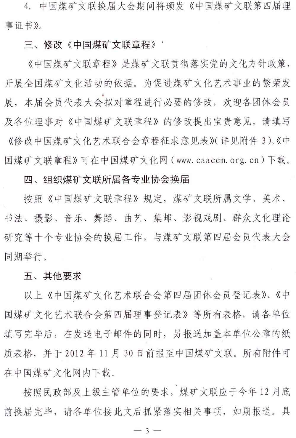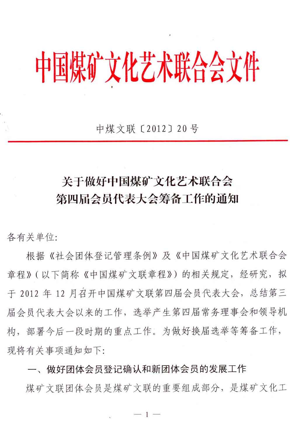 關于做好中國煤礦文聯第四屆會員代表大會籌備工作的通知 來源:中國煤礦文化網 作者:煤礦文聯 時間:2012-11-19 【字體:小 大】 附件: 1、中國煤礦文化藝術聯合會第四屆團體會員登記表 2、中國煤礦文化藝術聯合會第四屆理事登記表 3、修改《中國煤礦文化藝術聯合會章程》征求意見表 4、中國煤礦文化藝術聯合會第三屆團體會員名單 5、中國煤礦文化藝術聯合會第三屆理事名單 分享到: 【打印正文】