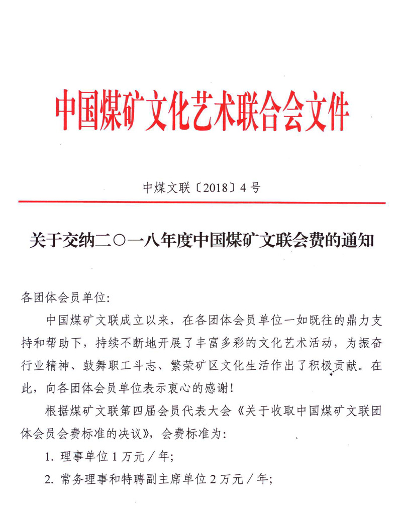 關于交納二○一八年度中國煤礦文聯會費的通知