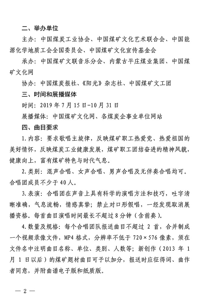 關于舉辦第三屆全國煤礦職工合唱展播活動的通知 來源:中國煤礦文聯 作者: 時間:2019-03-11 【字體:小 大】 關于舉辦第五屆中國煤礦藝術節第三屆全國煤礦職工合唱展播活動的通知(PDF版)附件:第五屆中國煤礦藝術節第三屆全國煤礦職工合唱展播登記表 智能標簽: 中國煤礦藝術節 相關內容 分享到: 【打印正文】