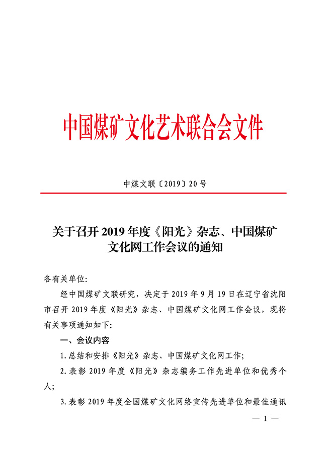 關于召開2019年度《陽光》雜志、中國煤礦文化網工作會議的通知 來源:中國煤礦文聯 作者: 時間:2019-09-02 【字體:小 大】 附件:· 關于召開2019年度《陽光》雜志、中國煤礦文化網工作會議的通知(PDF版,含附件1-2)· 會議回執(附件3) 智能標簽: 中國煤礦文聯 相關內容 分享到: 【打印正文】