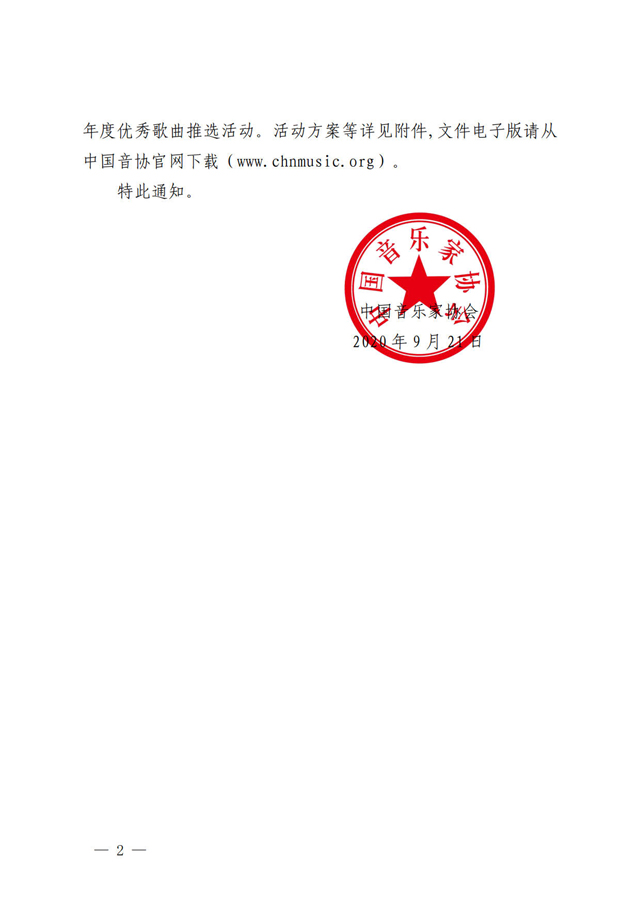 中國(guó)音協(xié):中國(guó)當(dāng)代歌曲創(chuàng)作精品工程“聽見中國(guó)聽見你”2020年度優(yōu)秀歌曲推選 活動(dòng)通知 來源:中國(guó)音協(xié) 作者: 時(shí)間:2020-10-12 【字體:小 大】 附件1:2020聽見中國(guó)聽見你方案(定版)附件2:2020聽見中國(guó)聽見你個(gè)人作品登記表附件3:2020聽見中國(guó)聽見你團(tuán)體作品報(bào)送表(定版) 分享到: 【打印正文】