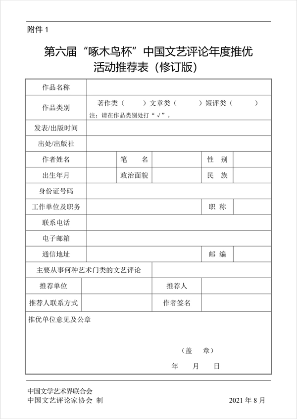 其他要求請(qǐng)參見《中國(guó)文聯(lián)辦公廳關(guān)于舉辦第六屆“啄木鳥杯”中國(guó)文藝評(píng)論年度推優(yōu)活動(dòng)的通知》(文聯(lián)辦發(fā)〔2021〕63號(hào))。
