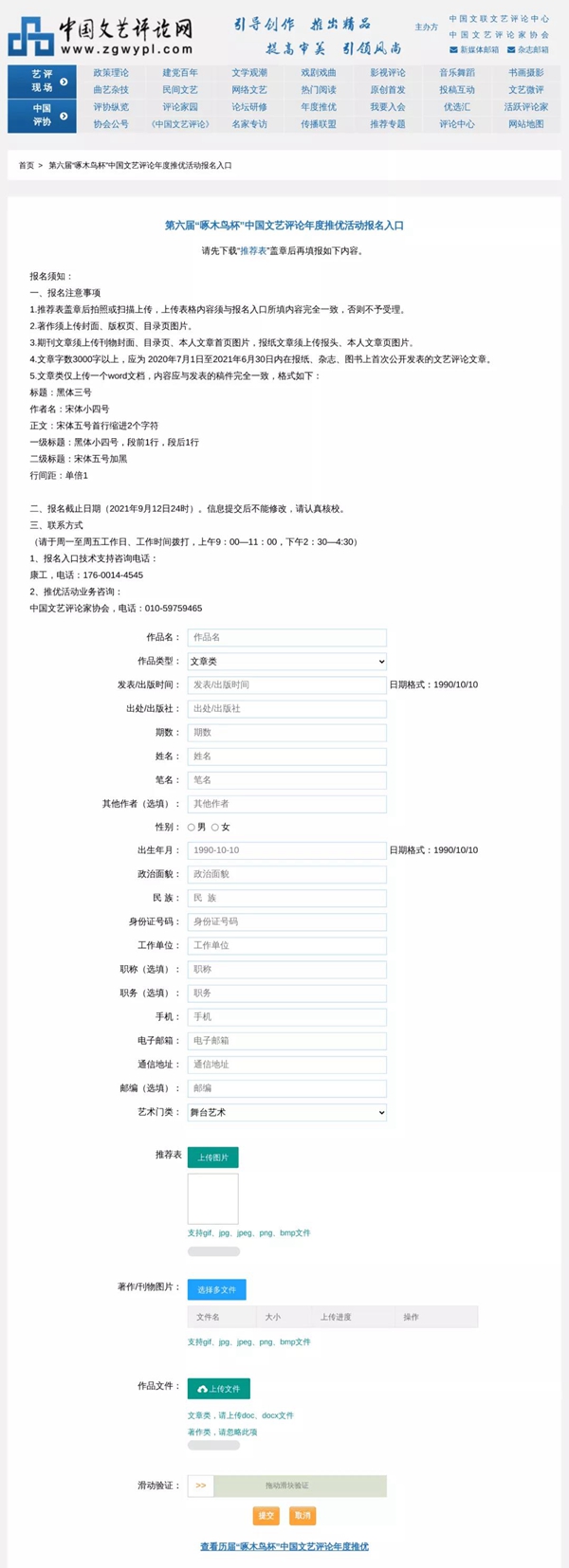 5. 本屆活動采取網上申報和線下申報同步進行的方式,參評信息一旦在網上確認提交,將無法撤回修改。為此,請各參評作品嚴格按照通知具體要求整理好相關材料并請推薦單位進行審核,確認無誤后在線下載打印填寫報名表(網址:http://www.zgwypl.com/tuiyou),并請相關單位蓋章后將電子版(拍照或掃描圖片)上傳回網站。作品原件和報名登記表蓋章原件寄送至中國文藝評論家協會,確保線上線下同步提交,以免造成報名不成功。