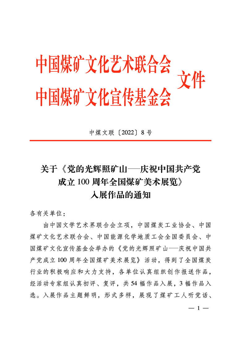 關于《黨的光輝照礦山——慶祝中國共產黨成立100周年全國煤礦美術展覽》入展作品的通知