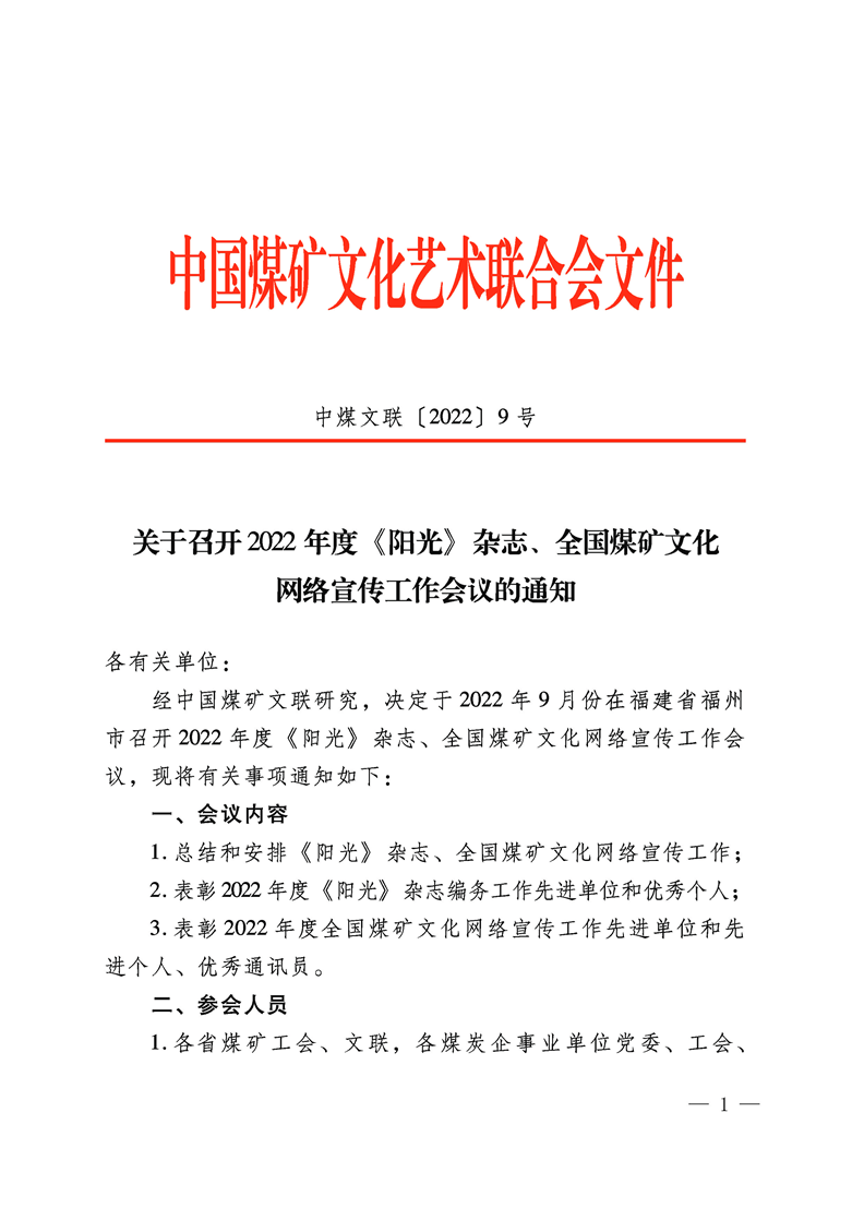關于召開2022年度《陽光》雜志、全國煤礦文化網絡宣傳工作會議的通知