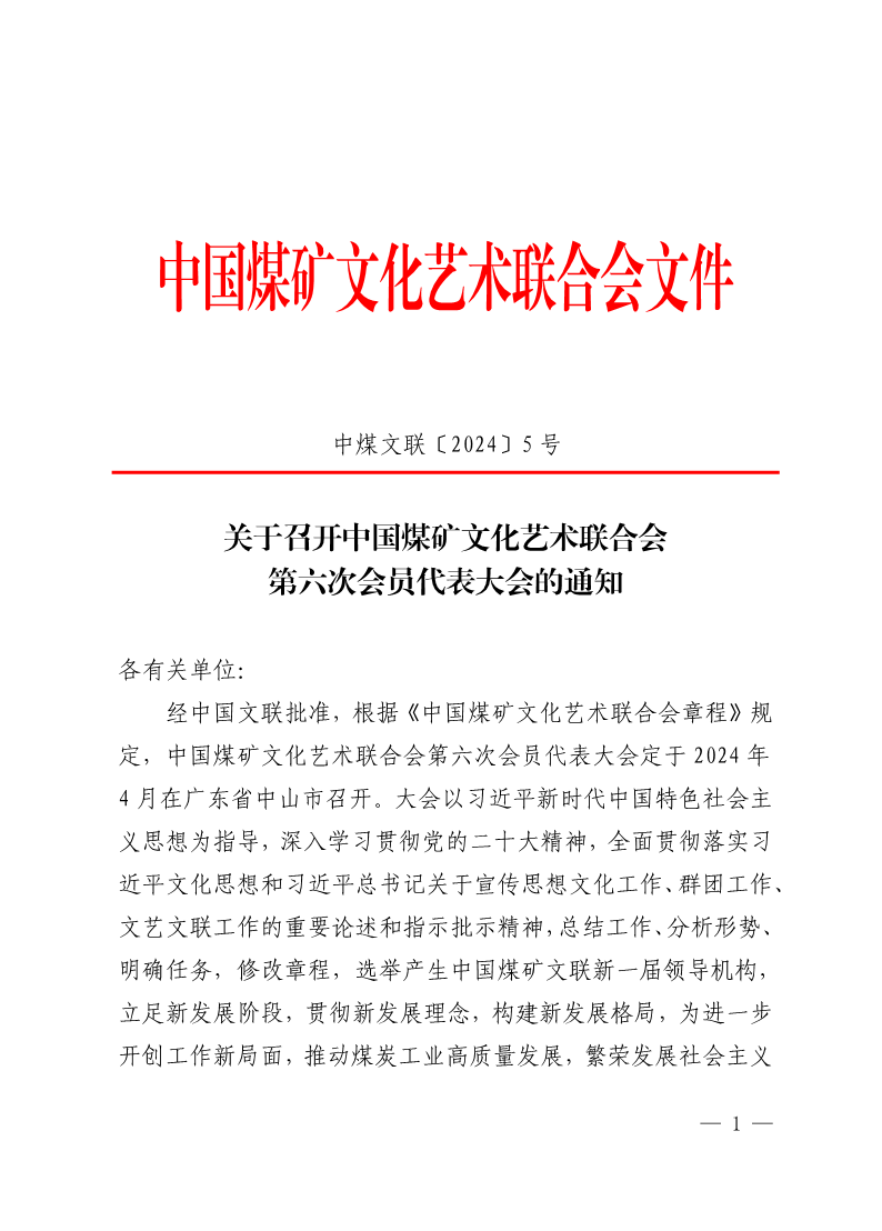 關(guān)于召開中國煤礦文化藝術(shù)聯(lián)合會(huì)第六次會(huì)員代表大會(huì)的通知