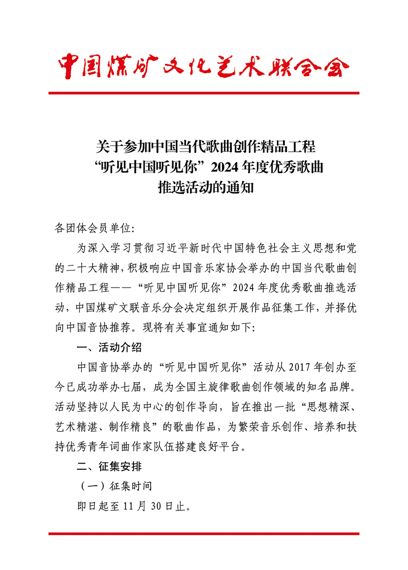 關(guān)于參加中國當(dāng)代歌曲創(chuàng)作精品工程“聽見中國聽見你”2024年度優(yōu)秀歌曲推選活動的通知 來源:中國煤礦文聯(lián) 作者: 時間:2024-11-06 【字體:小 大】 附件1-2:《作品登記表》《作品授權(quán)書》 分享到: 【打印正文】