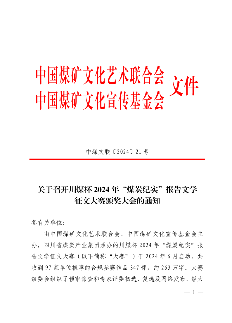 關于召開川煤杯2024年“煤炭紀實”報告文學征文大賽頒獎大會的通知