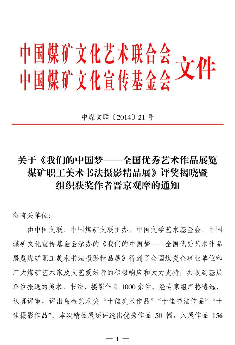 關于《我們的中國夢——全國優秀藝術作品展覽煤礦職工美術書法攝影精品展》評獎揭曉暨組織獲獎作者晉京觀摩的通知 來源:中國煤礦文聯 作者:中國煤礦文聯 時間:2014-09-12 【字體:小 大】 附件1.《我們的中國夢全國優秀藝術作品展覽煤礦職工美術書法攝影精品展》獲獎、入展作品名單 附件2.《我們的中國夢全國優秀藝術作品展覽煤礦職工美術書法攝影精品展》參展人員回執 分享到: 【打印正文】