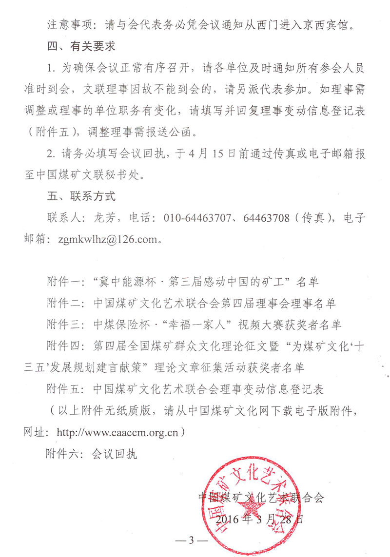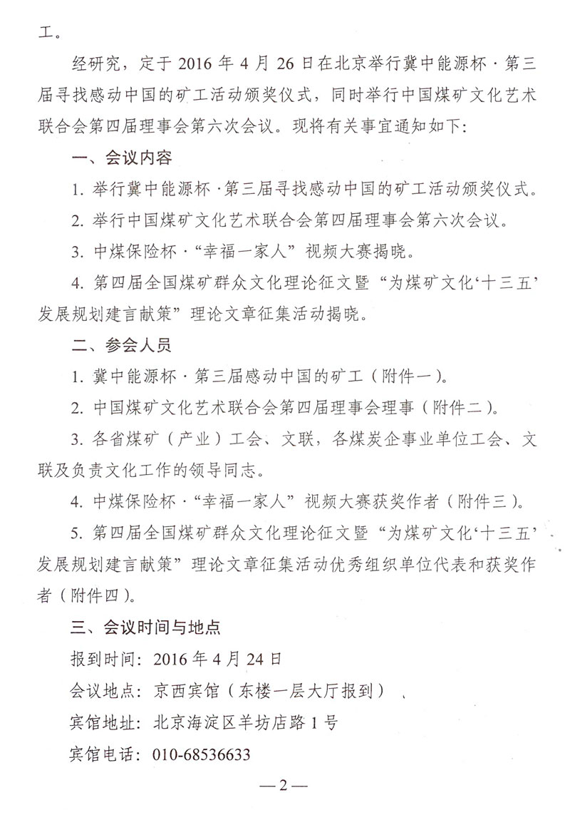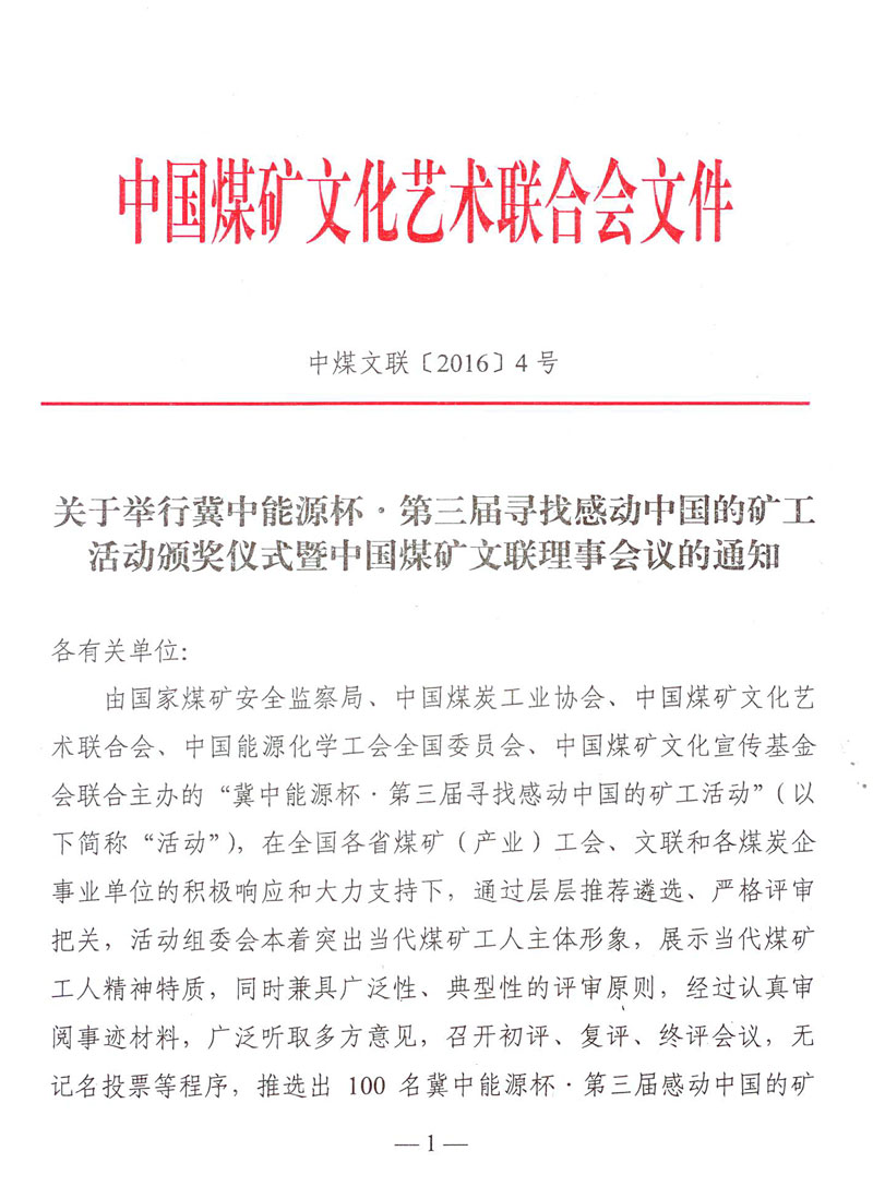 冀中能源杯·第三屆尋找感動中國的礦工活動頒獎儀式通知 來源:中國煤礦文聯 作者: 時間:2016-04-01 【字體:小 大】 附件一:“冀中能源杯·第三屆感動中國的礦工”名單 附件二:中國煤礦文化藝術聯合會第四屆理事會理事名單 附件三:中煤保險杯·“幸福一家人”視頻大賽獲獎者名單 附件四:第四屆全國煤礦群眾文化理論征文暨“為煤礦文化‘十三五’發展規劃建言獻策”理論文章征集活動獲獎者名單 附件五:中國煤礦文化藝術聯合會理事變動信息登記表 附件六:會議回執 智能標簽: 冀中能源杯 感動中國的礦工 理事會議 相關內容 分享到: 【打印正文】