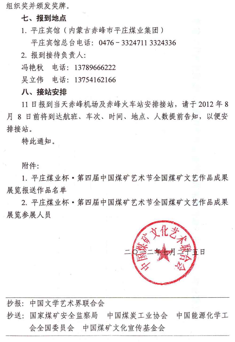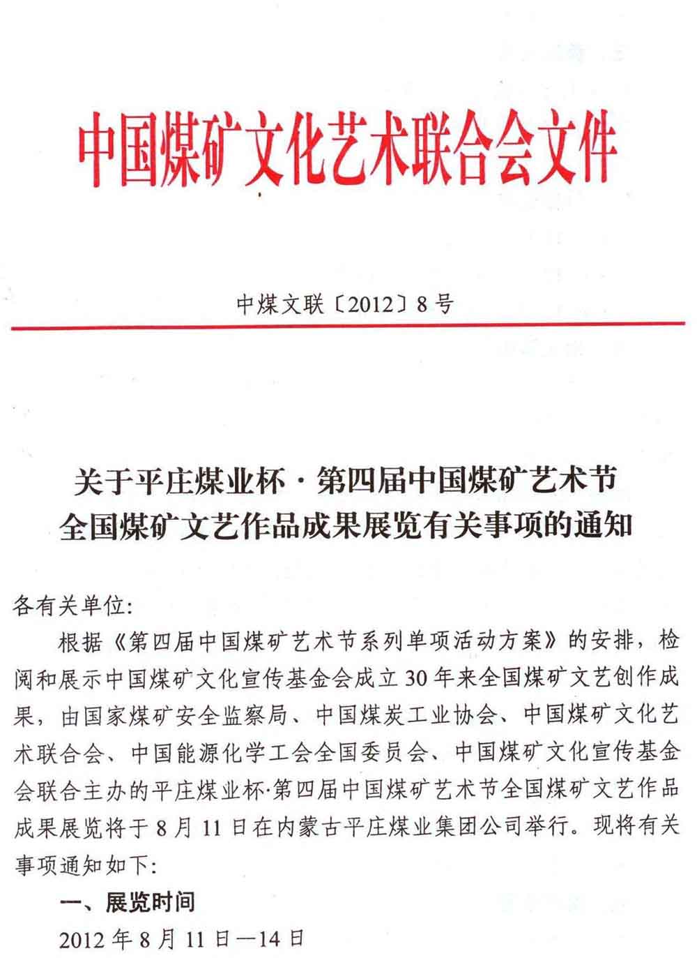 關于平莊煤業(yè)杯·第四屆中國煤礦藝術節(jié)全國煤礦文藝作品成果展覽有關事項的通知 來源:中國煤礦文化網(wǎng) 作者: 時間:2012-07-27 【字體:小 大】 附件:平莊煤業(yè)杯·第四屆中國煤礦藝術節(jié)全國煤礦文藝作品成果展覽報送作品名單及參展人員回執(zhí) 分享到: 【打印正文】