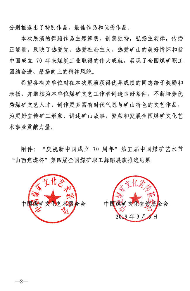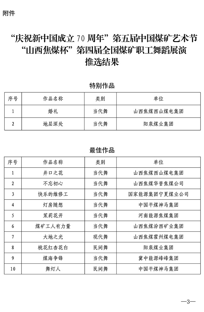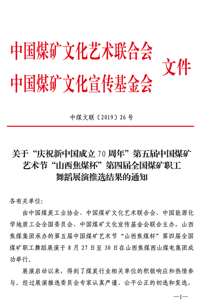 關于“慶祝新中國成立70周年”第五屆中國煤礦藝術節“山西焦煤杯”第四屆全國煤礦職工舞蹈展演推選結果的通知 來源:中國煤礦文聯 作者: 時間:2019-10-30 【字體:小 大】 關于“慶祝新中國成立70周年”第五屆中國煤礦藝術節“山西焦煤杯”第四屆全國煤礦職工舞蹈展演推選結果的通知(PDF版) 智能標簽: 中國煤礦文聯 中國煤礦藝術節 相關內容 分享到: 【打印正文】
