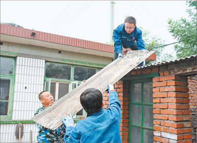 趙奮魁(上)幫助職工修房子。(資料圖片)