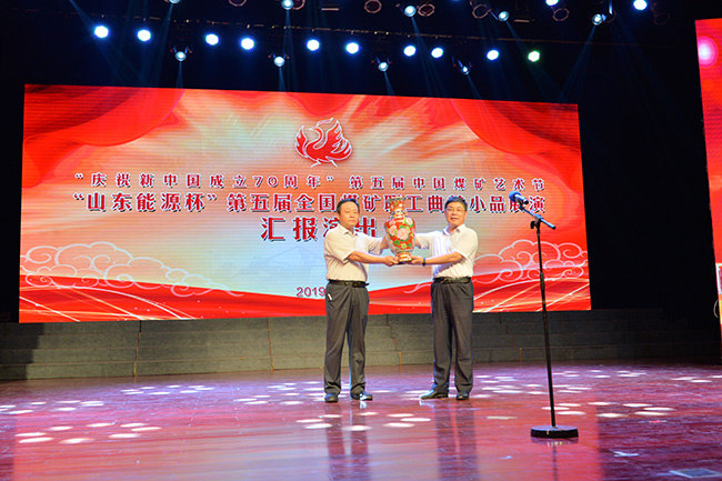 匯報演出前,張強向展演承辦單位山東能源集團贈送了第五屆中國煤礦藝術節“特別貢獻獎”杯。