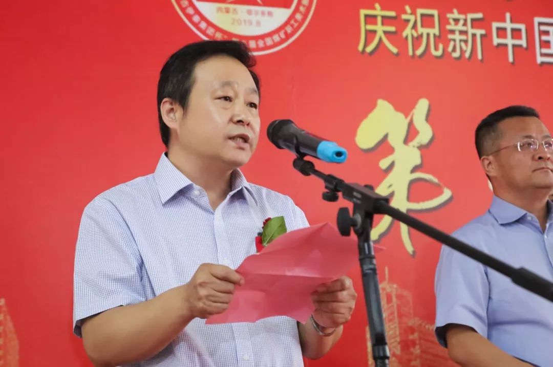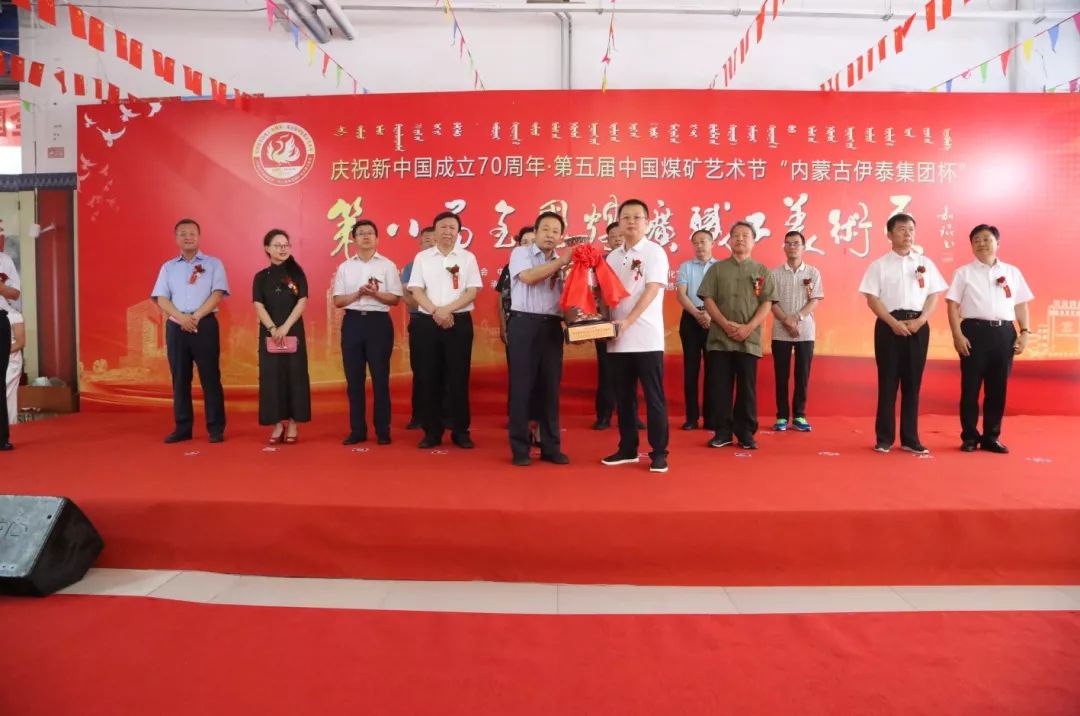 張強(qiáng)向內(nèi)蒙古伊泰集團(tuán)贈送了第五屆中國煤礦藝術(shù)特別貢獻(xiàn)獎杯并代表第五屆中國煤礦藝術(shù)節(jié)組委會講話。他指出,這一屆展覽,集中展示了煤礦美術(shù)界新時期的優(yōu)秀創(chuàng)作成果,是煤炭行業(yè)貫徹習(xí)近平總書記對在新的歷史條件下做好文藝工作“四個堅持”要求的具體舉措。這些美術(shù)作品表現(xiàn)形式豐富,表達(dá)內(nèi)容廣泛。展現(xiàn)了廣大煤礦美術(shù)工作者們飽含愛礦熱情和追夢精神,扎根礦山,立足黑色沃土,在波瀾壯闊的新時代揮彩潑墨、狀景描物,用一雙雙巧手繪就一幅幅美好礦山生活的五彩畫卷。他強(qiáng)調(diào),新時代要有新作為。廣大煤礦文藝工作者們要不惜腳力、聚集眼力、開動腦力、強(qiáng)化筆力,積極投身火熱的煤礦生活,用立得住、叫得響、傳得開的優(yōu)秀文藝作品謳歌礦山、贊美礦工,記錄新時代煤炭工業(yè)的輝煌發(fā)展成果,向偉大的新中國成立70周年獻(xiàn)禮!