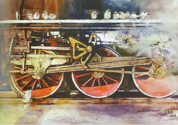 在展覽中還能看到煤礦人記憶中留存的煤礦發展的歷史印記:可春一的中國畫《不能忘記》里銹跡斑斑的火車,趙學峰《豐碑》里的“功勛號”火車,王春濤、侯鎮家共同創作的《蒸汽時代》里的“SY0888”火車和電鎬挖掘機以及高景權的水彩畫《歷程·印記》中小鳥棲息的火車輪的特寫……無聲地訴說著它們的豐功偉績。阜新礦業集團的孫永光創作的中國畫《情系煤海》生動重現了昔日亞洲第一大露天煤礦——阜新海州露天礦的采礦景象,畫面中煙塵滾滾,電鎬挖掘機正忙碌運轉。王春濤、侯鎮家的中國畫《蒸汽時代》也展示了電鎬挖掘機。曾是電鎬司機的王春濤介紹到:“最早采礦的露天四大機械就是火車、電鎬挖掘機、電鏟和鉤機,我們畫的電鎬挖掘機和第三套人民幣5元背面圖案中的電鎬挖掘機是同一型號。”
