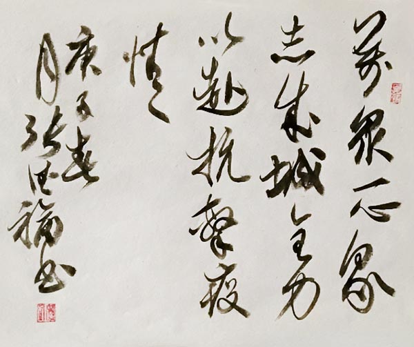 庚子新春,一場來勢洶洶的新型冠狀病毒感染的肺炎疫情在全國蔓延。面對疫情,習(xí)近平總書記作出重要指示,要求“廣泛動員群眾、組織群眾、凝聚群眾。緊緊依靠人民群眾堅決打贏疫情防控阻擊戰(zhàn)”。在武漢、在全國各地,無數(shù)奔赴在疫情一線的工作人員同舟共濟(jì)、眾志成城,冒著各種風(fēng)險堅守崗位,投身于這場必須打贏的疫情防控狙擊戰(zhàn)。在這場抗擊疫情的戰(zhàn)斗中,文藝工作者不能缺席。中國煤礦文聯(lián)迅速組織全行業(yè)文藝工作者積極行動起來,為堅決遏制疫情蔓延勢頭、打贏疫情防控阻擊戰(zhàn)鼓與呼,創(chuàng)作出一大批各種形式的文藝作品,鼓舞全民士氣,致敬白衣天使,慰問病患同胞,傳遞人間真情,弘揚社會正能量。中國煤礦書法家協(xié)會迅速行動起來,組織煤礦書法家,用心研墨,以愛為紙,將自己的創(chuàng)作激情,化作了對疫情的關(guān)切之情,兩天時間創(chuàng)作了數(shù)百件鼓舞士氣,振奮精神的書法、篆刻作品。點畫間傳達(dá)了550萬煤礦工人聲援武漢,抗擊疫情的信心和決心,表達(dá)了對江城武漢的祈福、對偉大祖國的祝愿。