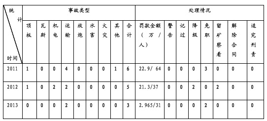 對(duì)事故人員處理,按照事故性質(zhì)惡劣程度、事故的危害程度、事故的損失程度,王村煤礦按照礦業(yè)公司獎(jiǎng)懲條例對(duì)相關(guān)人員處理分為八個(gè)等級(jí):最嚴(yán)重的是追究刑事責(zé)任,最輕的進(jìn)行警告;根據(jù)事故危害程度,經(jīng)濟(jì)處罰最低100元,最高可達(dá)到10000元。2011年上半年,王村煤礦對(duì)3名班組長(zhǎng)進(jìn)行免職處理,并調(diào)離工作崗位;2012年上半年,對(duì)2名區(qū)隊(duì)黨政正職進(jìn)行降級(jí)處理,對(duì)2名職工進(jìn)行留用察看處理;2013年上半年僅對(duì)2名免去現(xiàn)場(chǎng)班組長(zhǎng)職務(wù)。下面,用一組統(tǒng)計(jì)數(shù)字來(lái)表現(xiàn)親情文化在安全管理中的成效。