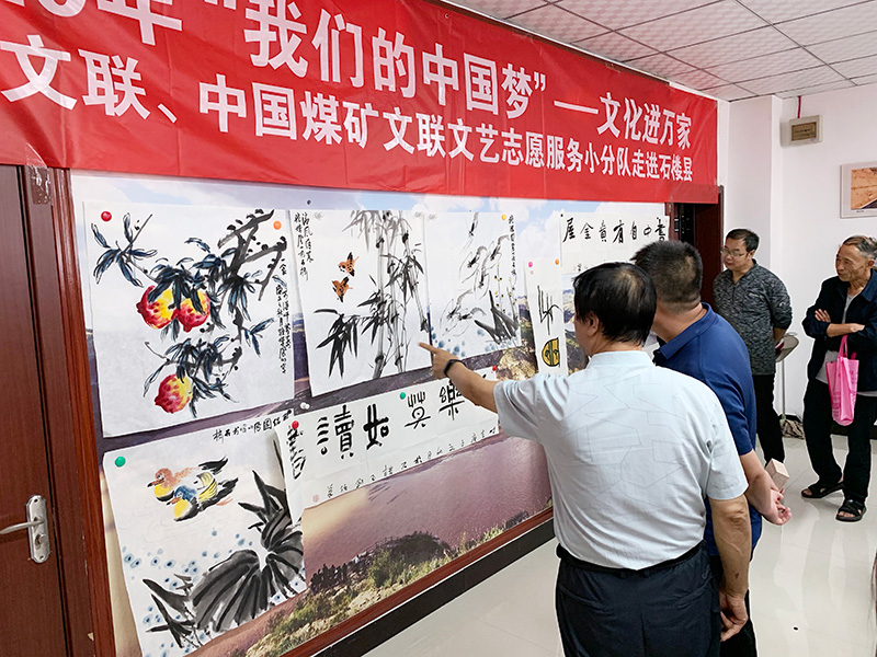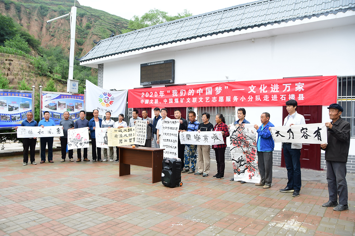 8月16日至19日,中國文聯、中國煤礦文聯文藝志愿服務小分隊走進石樓縣開展2020年“我們的中國夢”——文化進萬家活動。中國煤礦文聯秘書長、中國煤礦文聯志愿者協會主席盛軍帶隊,中國煤礦文聯宣傳處處長、中國煤礦文聯志愿者協會秘書長辛凡忠,中國煤礦文聯書協副主席馬銘、楊玉劍,副秘書長侯建偉,理事傅澍乾;中國煤礦文聯美協理事馬鳳山、周先寶、侯平遠、梁志強等煤礦書法美術家參加文藝志愿服務。活動期間,小分隊先后在義牒鎮褚家峪村、石樓縣文化大樓和精石文化培訓中心進行書畫作品贈送、現場創作、書法講座和書畫作品點評輔導等,受到廣大群眾的熱烈歡迎。